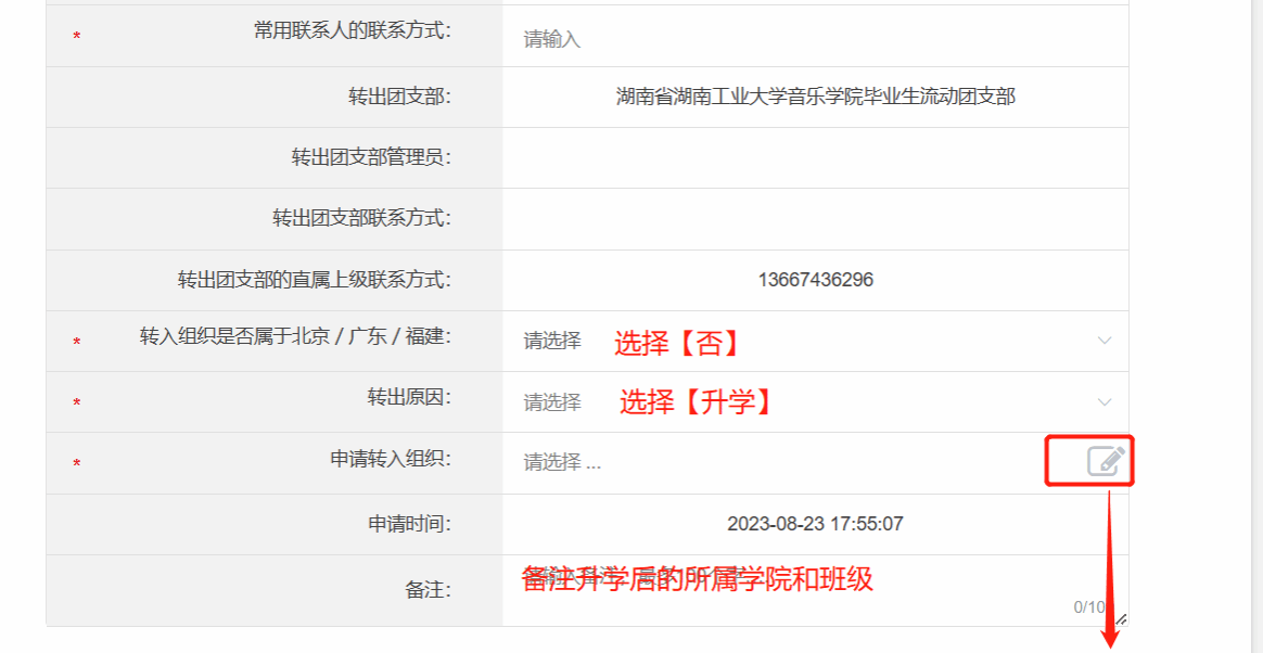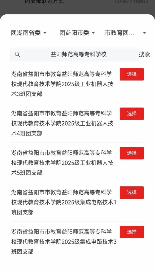 3.选择申请转入组织:团湖南省委-团益阳市委-市教育团工委;根据录取情况输入“益阳师范高等专科学校”,搜索并选择本人的班级(团支部)。